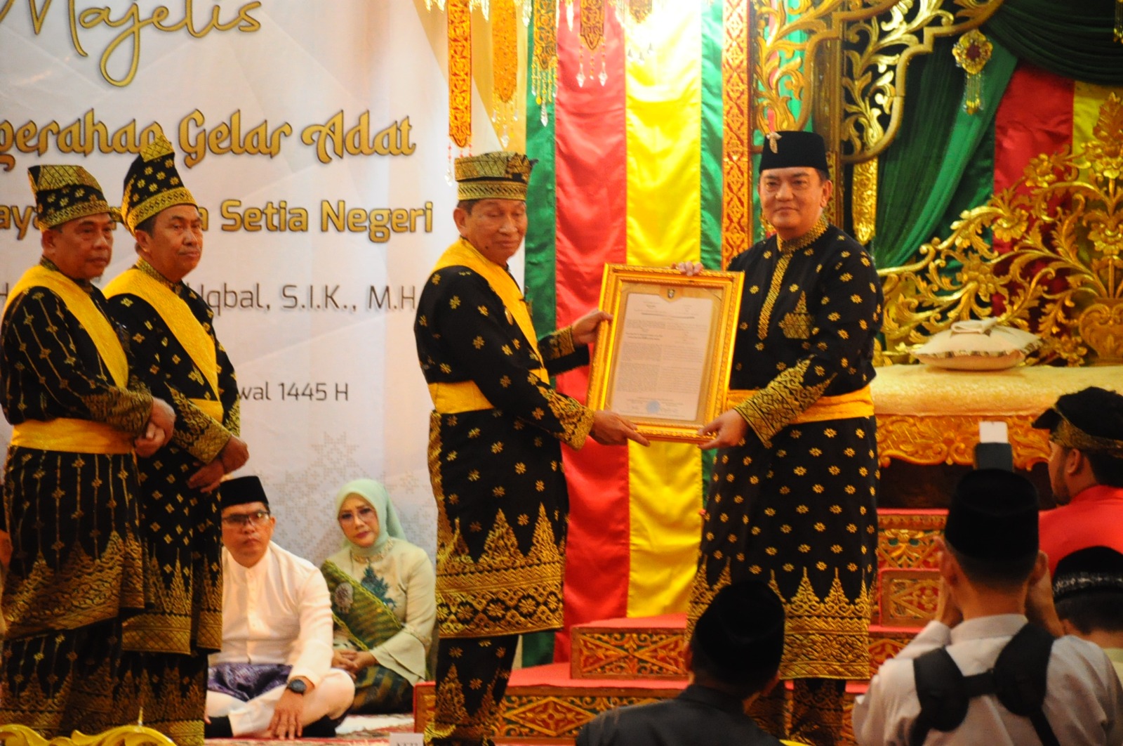 Penganugerahan gelar adat kepada Kapolda Riau berdasarkan Surat Keputusan LAMR Nomor SK 089/LAMR/IX/2023 tentang anugerah gelar adat kepada Tuan Polisi Irjen Pol. H. Mohammad Iqbal, S.I.K., M.H, Kapolda Riau.