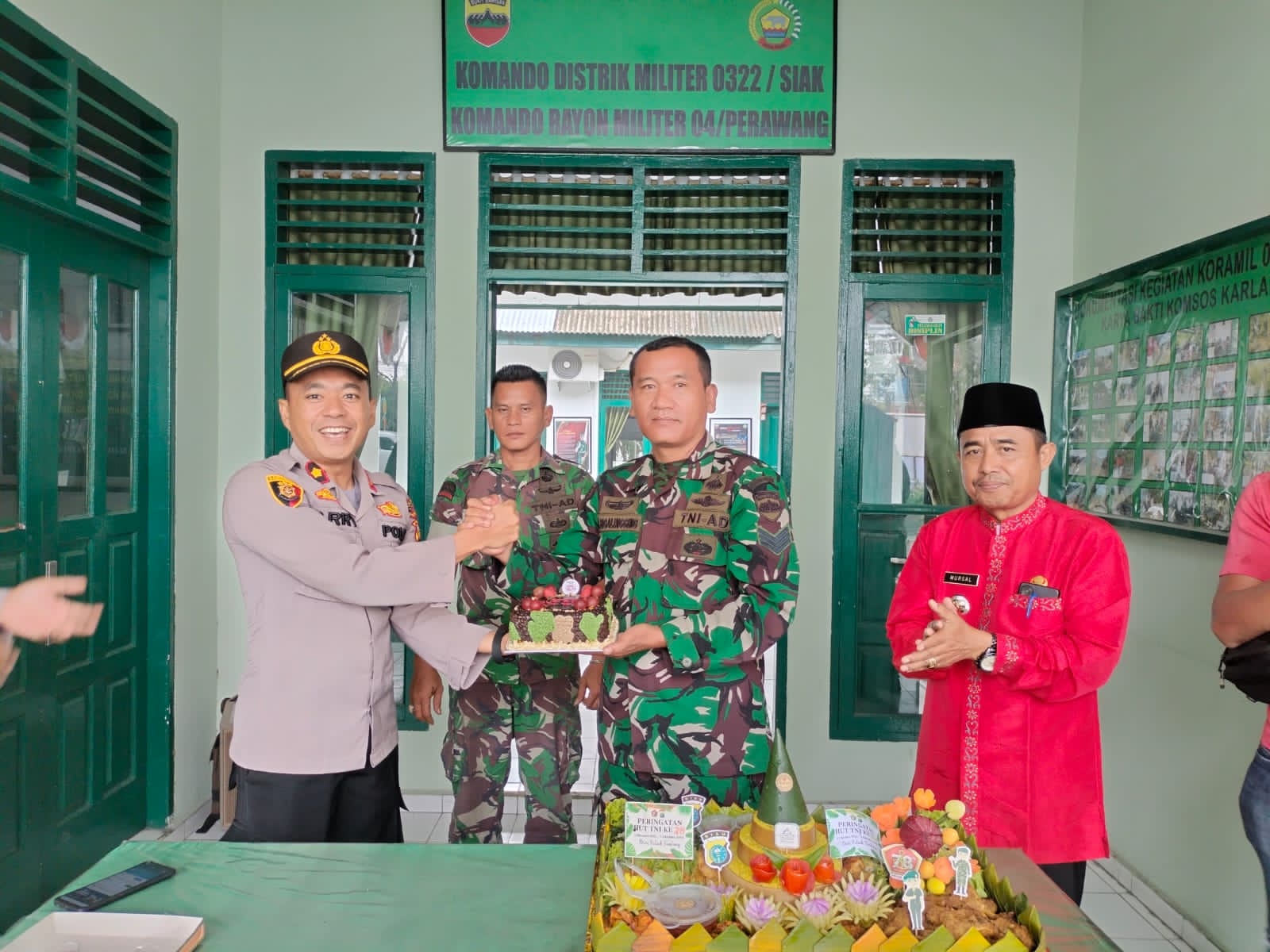 Kapolsek Tualang, Kompol Arry Prasetyo, SH.MH, memimpin secara langsung seremoni pemberian nasi tumpeng kepada Koramil 04/Perawang. Pemberian tersebut juga disambut dengan hangat oleh Serma Sigalinging, yang didampingi oleh Bhabinsa Tualang, Serka A. Sigalingging, beserta personil jaga lainnya. Mereka mewakili Danramil Perawang dan personil Koramil 04/Perawang dalam merayakan HUT TNI ke-78 yang berlangsung dengan sederhana namun sarat makna.