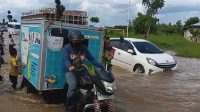 Pantauan di lokasi terlihat adanya antrian kendaraan yang disebabkan oleh genangan air akibat curah hujan yang tinggi beberapa hari ini di kota Pekanbaru.