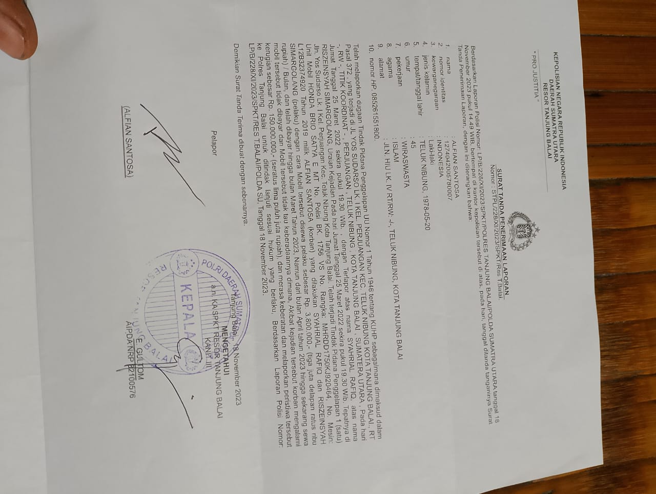 Berdasarkan tanda bukti lapor Alfian pada tanggal 18 Nopember 2024 nomor LP /B/228/XI/SPKT/2023/polres tanjung balai – polda sumatra utara, Alfian yang telah melaporkan dua orang terduga pelaku penggelapan satu unit mobil Honda Brio Setya E MT BK 1756 VS. dengan cara mobil tersebut disewa oleh kedua pelaku sebesar 3.800.000,00(tiga juta delapan ratus ribu rupiah )/bulan, namun miris penyidik polres Tanjung balai Aiptu Y Siburian belum dapat mengungkap atas laporan dugaan penggelapan tersebut.
