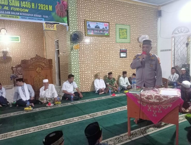 KAMPAR, sahabattnipolricom – Polsek Xlll Koto Kampar AKP Sumaryadi menghadiri Tabligh Akbar dalam memperingati Maulid Nabi Muhammad SAW 1446 H / 2024 di Wilkum Polsek Xlll Koto Kampar bertempat di Mesjid Al-furqan Kelurahan Batu Bersurat Pukul 18.20 Wib, Sabtu malam (21/9/2024).