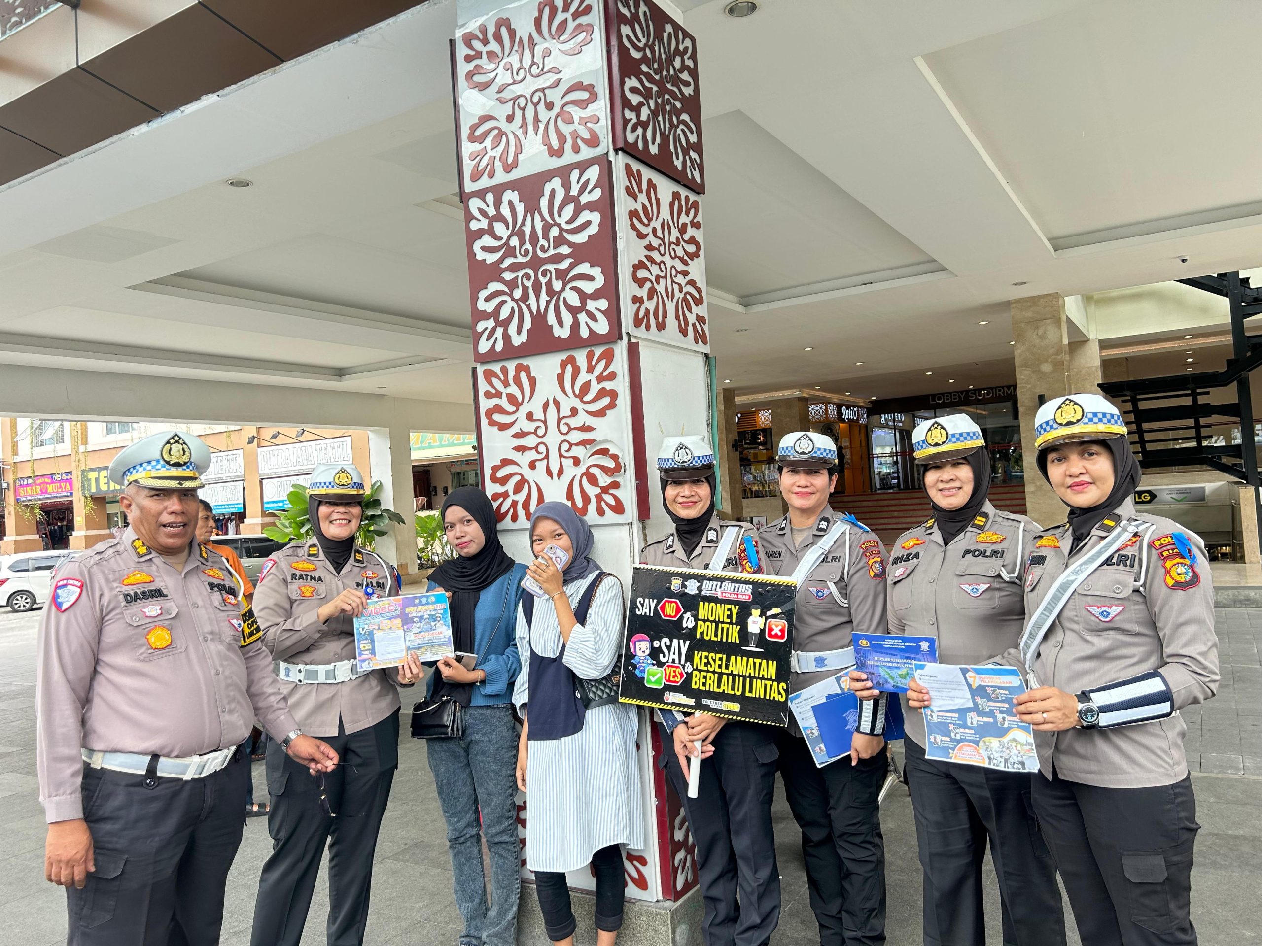Selama kegiatan, Tim Cooling System Satlantas Polres Kampar membagikan brosur dan menggunakan spanduk serta papan gimik untuk menyampaikan pesan. Menariknya, pesan-pesan seperti “Ayok Tertib Berlalu Lintas” hingga ajakan untuk tidak golput.